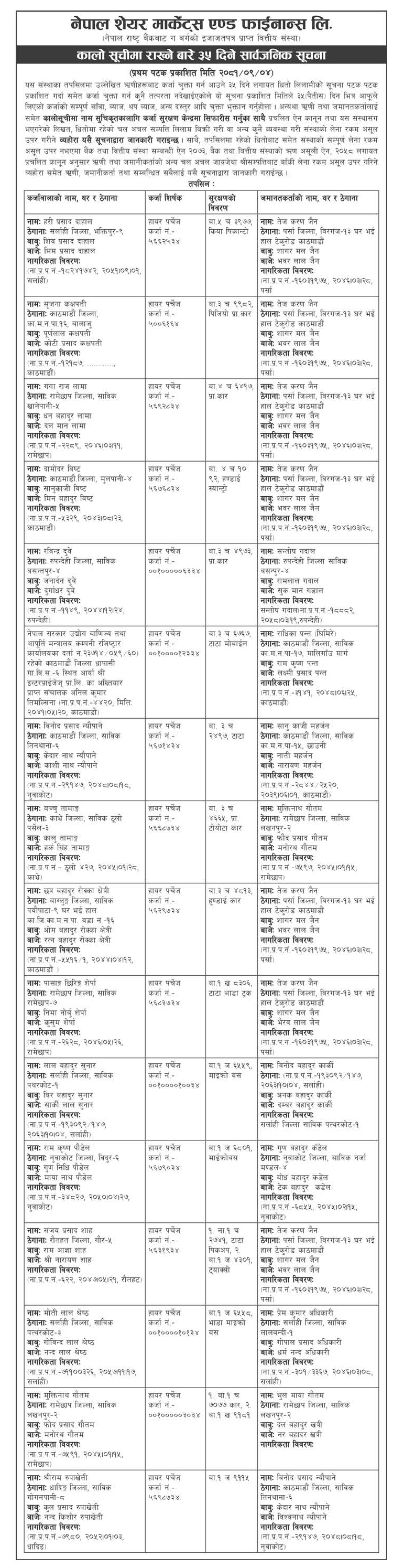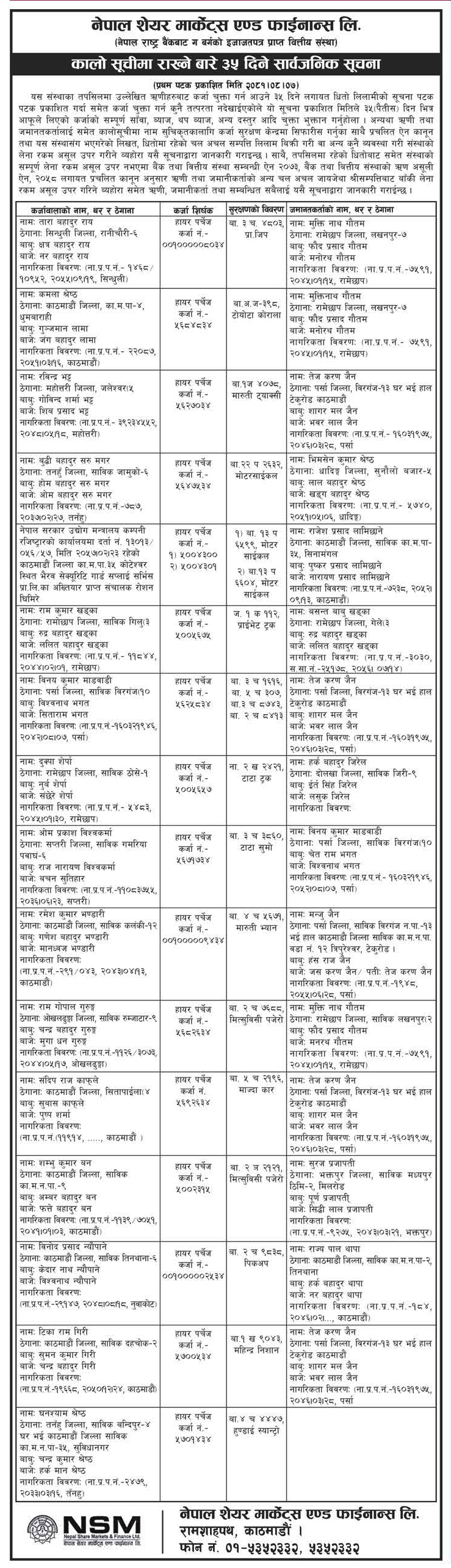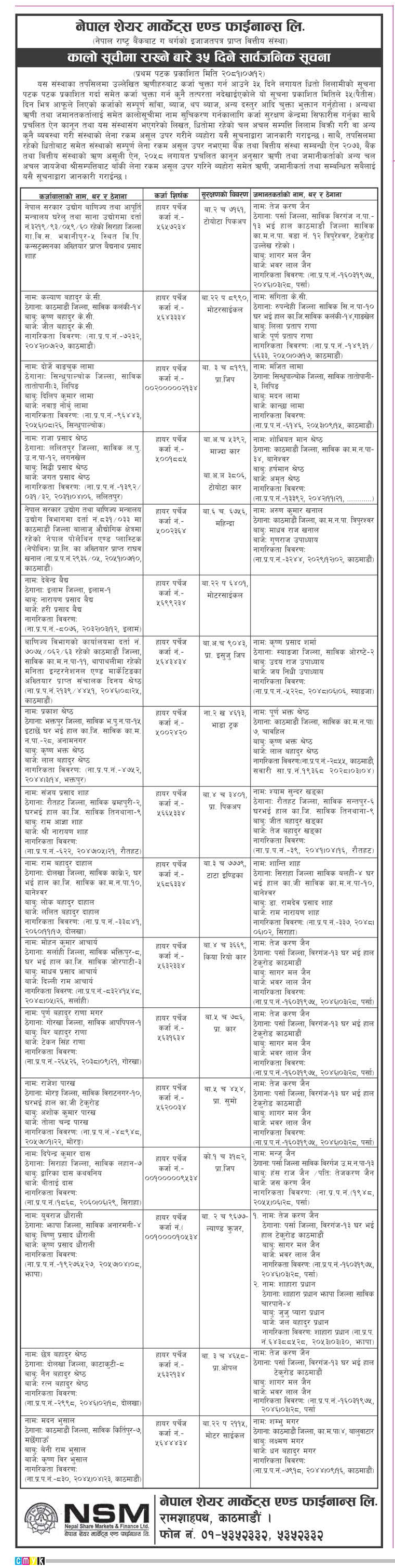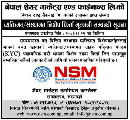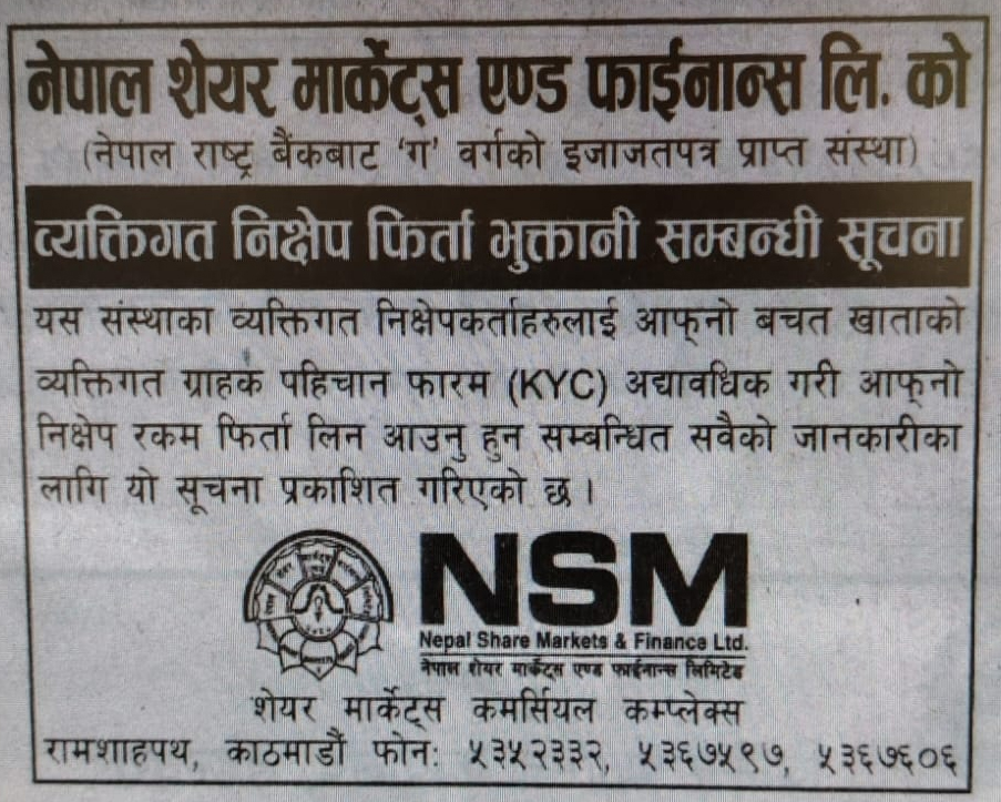 Learn moreNepal Share Markets & Finance Limited, hereinafter referred to as NSM, was incorporated under the Companies Act, 2063 as a public limited company with Registration No. 25/049/50 on Ashadh 15, 2050 (June 29, 1993). On Baishakk 5, 2063 (April 14, 2006), NSM obtained a license from Nepal Rastra Bank to carry out banking functions. It was registered in the Inland Revenue Department on Jestha 32, 2057 (June 14, 2000), with permanent account number 500058088. The company’s head office is located at Ramshahpath Putalisadak, Ward No. 28, Kathmandu, Nepal. On Poush 28, 2068 (January 28, 2012),